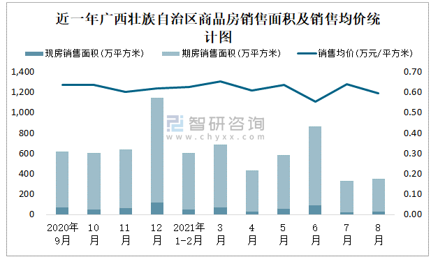 近一年廣西壯族自治區商品房銷售面積及銷售均價統計圖