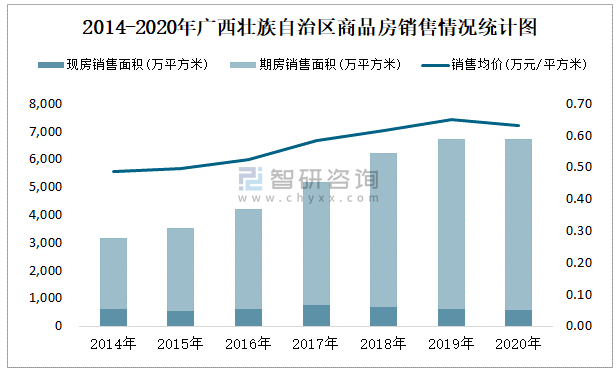 根據國家統計局數據統計可知:2021年8月廣西壯族自治區商品房銷售面積為352.46萬平方米(其中銷售現房28.42萬平方米,期房324.04萬平方米),銷售額為209.48億元,銷售均價約為0.59萬元/平方米;2021年1-8月廣西壯族自治區商品房累計銷售面積為3847.49萬平方米,銷售面積累計同比增長3.5%,累計銷售額為2353.65億元,銷售額累計同比下降1%;2014-2020年廣西壯族自治區商品房總銷售面積逐年遞增,其中期房銷售面積大大高于現房銷售面積,銷售均價2019年達到最高值,此后有所下滑。