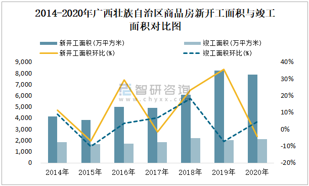 2014-2020年廣西壯族自治區商品房新開工面積與竣工面積對比圖