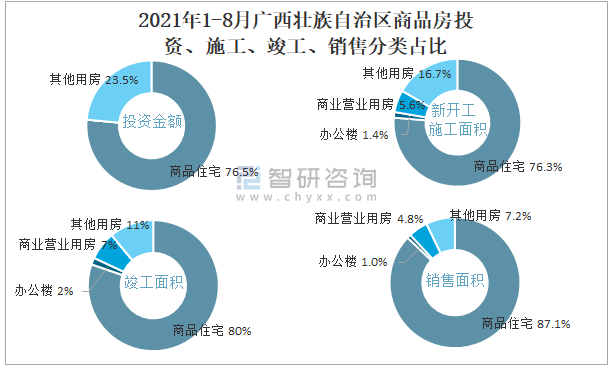 2021年1-8月廣西壯族自治區商品房投資、施工、竣工、銷售分類占比