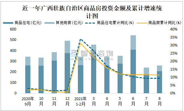 根據國家統計局數據統計可知:2021年8月廣西壯族自治區房地產開發投資商品房投資金額為262.38億元(其中商品住宅為207.01億元,辦公樓、商業營業用房等其他用房55.37億元);2021年1-8月廣西壯族自治區房地產開發投資商品房累計投資金額為2549.07億元,投資金額累計同比增長11.4%。