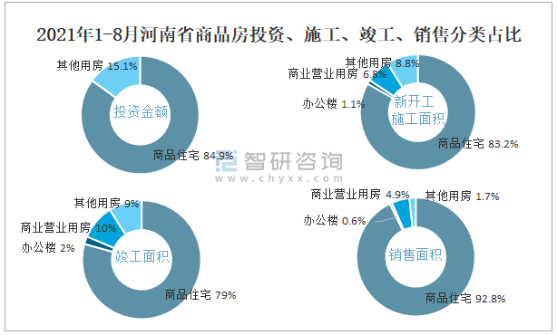 2021年1-8月河南省商品房投資、施工、竣工、銷售分類占比