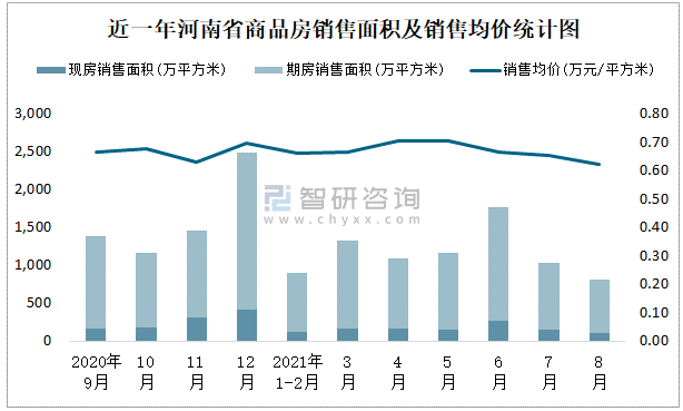 根據國家統計局數據統計可知:2021年8月河南省商品房銷售面積為804.63萬平方米(其中銷售現房112.03萬平方米,期房692.6萬平方米),銷售額為500.28億元,銷售均價約為0.62萬元/平方米;2021年1-8月河南省商品房累計銷售面積為8051.69萬平方米,銷售面積累計同比增長5.5%,累計銷售額為5380.78億元,銷售額累計同比增長6.8%;2014-2020年河南省商品房總銷售面積2019年達到最高值,此后有所下滑,其中期房銷售面積大大高于現房銷售面積,銷售均價逐年遞增。