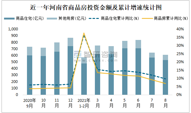 根據國家統計局數據統計可知:2021年8月河南省房地產開發投資商品房投資金額為608.19億元(其中商品住宅為531.59億元,辦公樓、商業營業用房等其他用房76.6億元);2021年1-8月河南省房地產開發投資商品房累計投資金額為4982.51億元,投資金額累計同比增長7%。