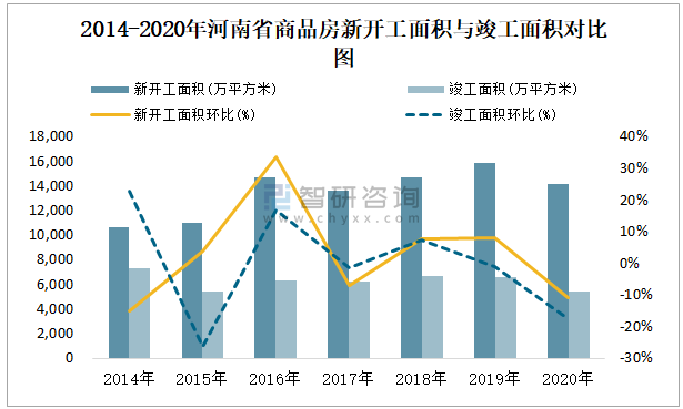 2014-2020年河南省商品房新開工面積與竣工面積對比圖