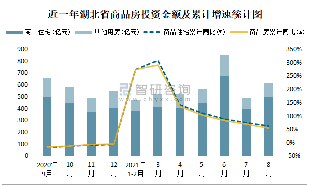 近一年湖北省商品房投資金額及累計增速統計圖