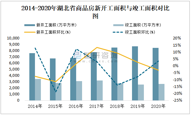 2014-2020年湖北省商品房新開工面積與竣工面積對比圖
