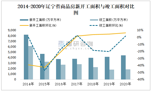 2014-2020年遼寧省商品房新開工面積與竣工面積對比圖