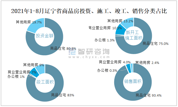 2021年1-8月遼寧省商品房投資、施工、竣工、銷售分類占比
