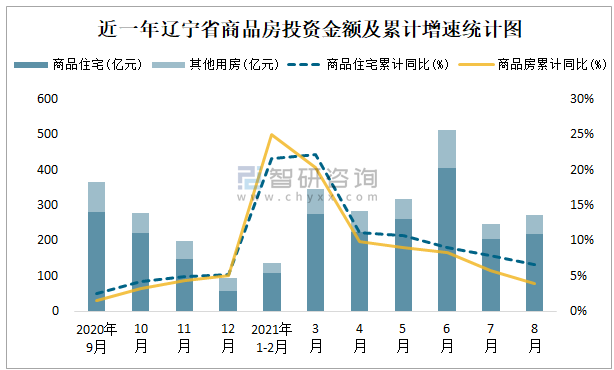 根據國家統計局數據統計可知:2021年8月遼寧省房地產開發投資商品房投資金額為273.74億元(其中商品住宅為218.61億元,辦公樓、商業營業用房等其他用房55.13億元);2021年1-8月遼寧省房地產開發投資商品房累計投資金額為2121.36億元,投資金額累計同比增長3.9%。