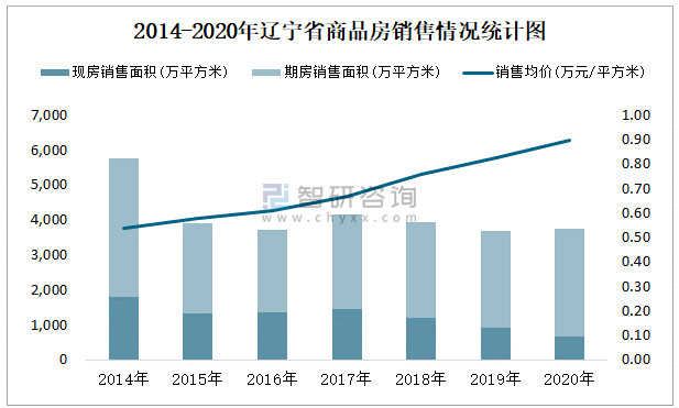 根據國家統計局數據統計可知:2021年8月遼寧省商品房銷售面積為285.73萬平方米(其中銷售現房46.77萬平方米,期房238.96萬平方米),銷售額為249.85億元,銷售均價約為0.87萬元/平方米;2021年1-8月遼寧省商品房累計銷售面積為2261.93萬平方米,銷售面積累計同比增長1.2%,累計銷售額為2101.36億元,銷售額累計同比增長4.8%;2014-2020年遼寧省商品房總銷售面積2019年跌至最低值,此后總體呈現上升趨勢,其中期房銷售面積大大高于現房銷售面積,銷售均價逐年遞增。