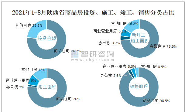 2021年1-8月陜西省商品房投資、施工、竣工、銷售分類占比