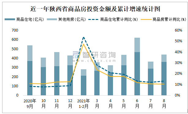 根據國家統計局數據統計可知:2021年8月陜西省房地產開發投資商品房投資金額為438.84億元(其中商品住宅為360.46億元,辦公樓、商業營業用房等其他用房78.38億元);2021年1-8月陜西省房地產開發投資商品房累計投資金額為2825.21億元,投資金額累計同比增長10.3%。