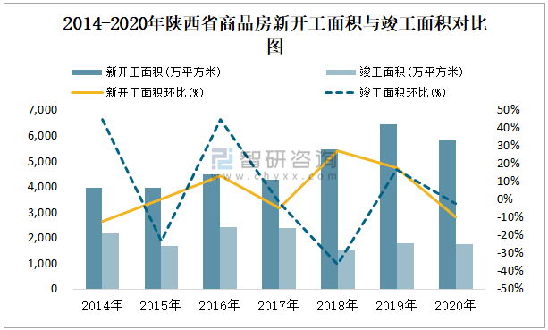 2014-2020年陜西省商品房新開工面積與竣工面積對比圖