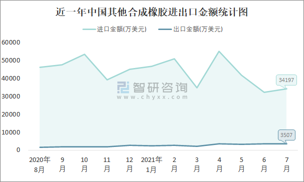 根據(jù)中國(guó)石油和化學(xué)工業(yè)聯(lián)合會(huì)數(shù)據(jù)顯示:2021年7月中國(guó)其他合成橡膠進(jìn)口數(shù)量為19.3萬(wàn)噸,出口數(shù)量為1.4萬(wàn)噸;進(jìn)口金額為34197萬(wàn)美元,出口金額為3507萬(wàn)美元;近一年中國(guó)其他合成橡膠出口總金額小于進(jìn)口總金額,貿(mào)易逆差為主,7月進(jìn)口均價(jià)1771.9美元/噸。