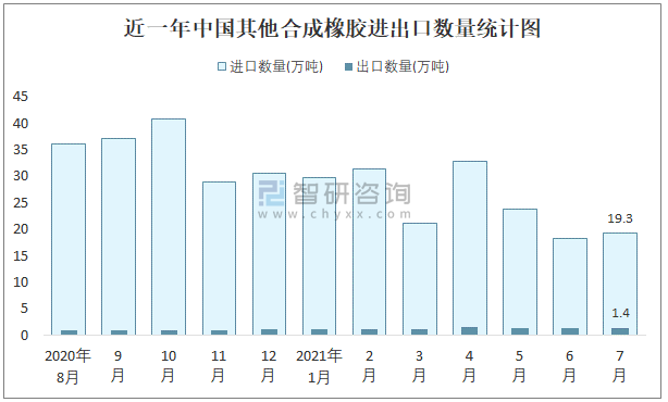近一年中國(guó)其他合成橡膠進(jìn)出口數(shù)量統(tǒng)計(jì)圖