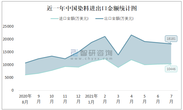 近一年中國染料進出口金額統(tǒng)計圖