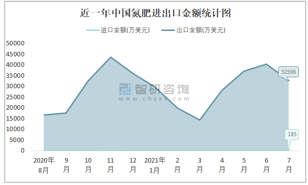 近一年中國氮肥進出口金額統計圖