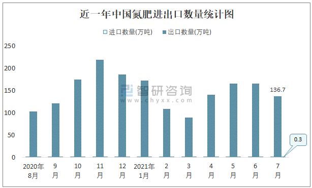 近一年中國氮肥進出口數量統計圖