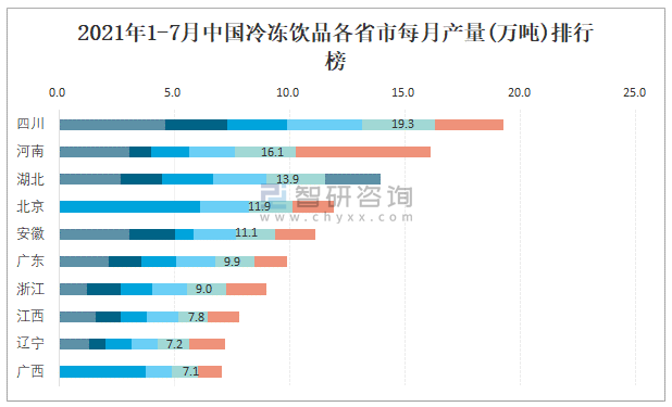 2021年1-7月中國冷凍飲品各省市每月產量排行榜