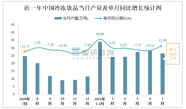 根據國家統計局數據顯示:2021年7月中國冷凍飲品產量為26.5萬噸,同比增長11.8%;2021年1-7月中國冷凍飲品累計產量為166.8萬噸,同比增長4.5%;2015-2020年中國冷凍飲品產量2017年達到最高,此后總體呈現下降趨勢。
