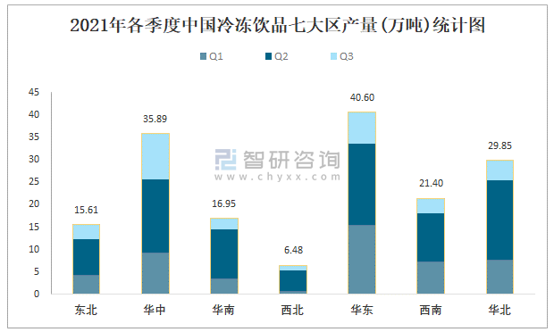 2021年各季度中國冷凍飲品七大區產量統計圖