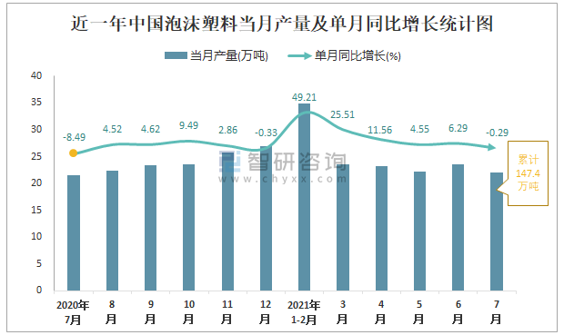 2021年1-7月中國泡沫塑料產量為147.4萬噸 同比增長12.88%