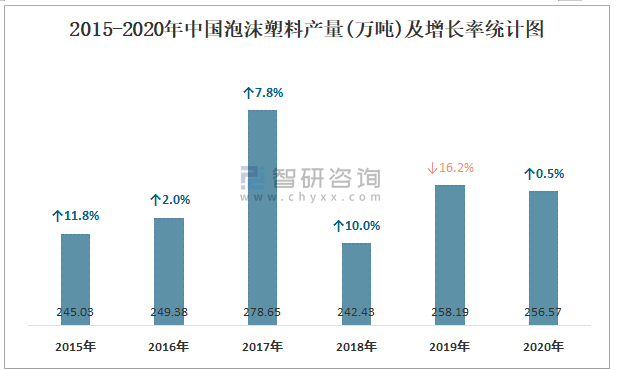 2015-2020年中國泡沫塑料產量及增長率統計圖