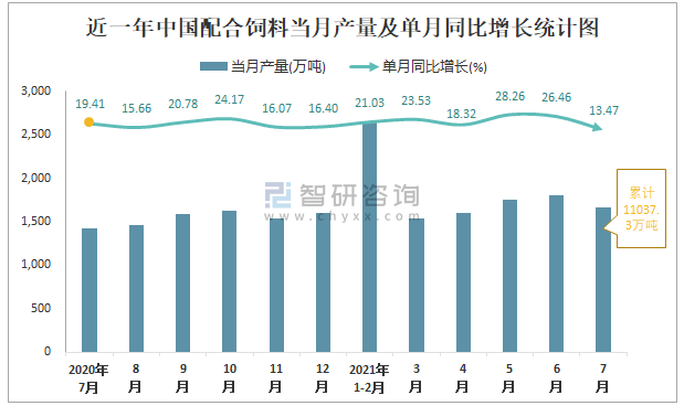 根據國家統計局數據顯示:2021年7月中國配合飼料產量為1662萬噸,同比增長13.47%;2021年1-7月中國配合飼料累計產量為11037.3萬噸,同比增長23.82%;2015-2020年中國配合飼料產量2018年跌至最低,此后逐年遞增。