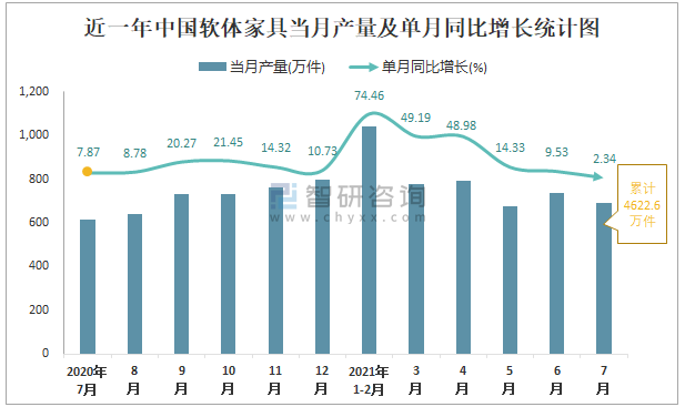 根據國家統計局數據顯示:2021年7月中國軟體家具產量為691萬件,同比增長2.34%;2021年1-7月中國軟體家具累計產量為4622.6萬件,同比增長24.45%;2015-2020年中國軟體家具產量2019年達到最高,次年有所下滑。