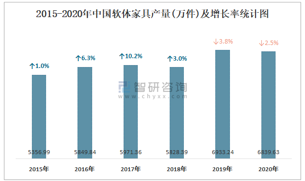 2015-2020年中國軟體家具產量及增長率統計圖
