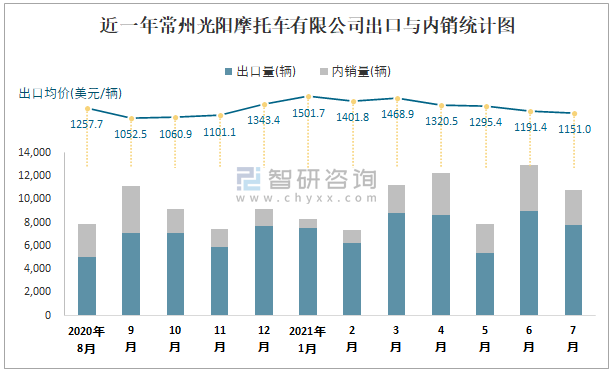 根據(jù)中國汽車工業(yè)(摩托車)產(chǎn)銷快訊數(shù)據(jù)統(tǒng)計可知:近一年常州光陽摩托車有限公司(摩托車)共積壓庫存2318輛,其產(chǎn)銷率存在一定幅度波動,2月產(chǎn)銷率最高(127.95%),清倉庫存1602輛,5月產(chǎn)銷率偏低(71.89%),積壓庫存3066輛;近一年常州光陽摩托車有限公司(摩托車)總體銷量以出口為主,總出口量占比總銷量的74.7%,出口均價1月達到最高值,此后總體呈現(xiàn)下降趨勢,其中7月出口量為7797輛,出口均價約為1150.96美元/輛;2021年1-7月常州光陽摩托車有限公司(摩托車)累計出口量為53406輛,同比增長33.96%,累計出口金額約為7108.4萬美元,同比增長43.96%。