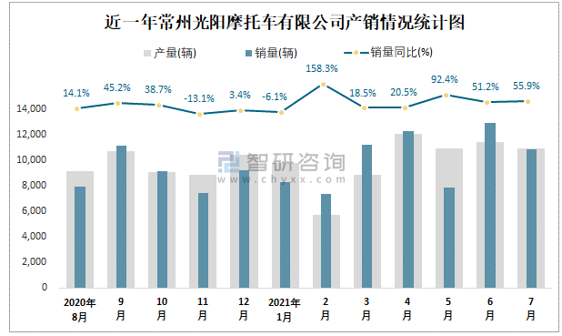 近一年常州光陽摩托車有限公司產(chǎn)銷情況統(tǒng)計圖