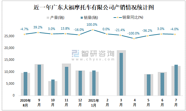 根據中國汽車工業(摩托車)產銷快訊數據顯示:2021年7月廣東大福摩托車有限公司(摩托車)產量為12520輛,同比下降4.43%,銷量為12980輛,同比下降4%;2021年1-7月廣東大福摩托車有限公司(摩托車)累計產量為68870輛,同比增長0.09%,累計銷量為68512輛,同比增長0.96%;2016-2020年廣東大福摩托車有限公司(摩托車)產銷量2016年達到最高值,此后總體呈現下降趨勢,且近5年總產量大于總銷量,積壓了庫存796輛,出口量偏少,銷量以內銷為主。