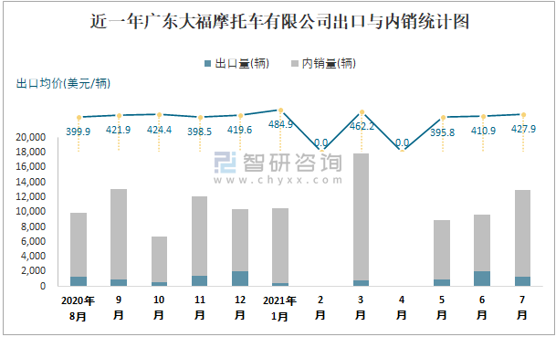 根據中國汽車工業(摩托車)產銷快訊數據統計可知:近一年廣東大福摩托車有限公司(摩托車)共積壓庫存1439輛,其產銷率存在一定幅度波動,2020年10月產銷率最高(109.74%),清倉庫存596輛,2020年11月產銷率偏低(89.83%),積壓庫存1375輛;近一年廣東大福摩托車有限公司(摩托車)出口量偏少,銷量以內銷為主,總出口量占比總銷量的10.6%,出口均價5月起逐月遞增,其中7月出口量為1299輛,出口均價約為427.94美元/輛;2021年1-7月廣東大福摩托車有限公司(摩托車)累計出口量為5905輛,同比增長59.25%,累計出口金額約為249.25萬美元,同比增長52.12%。