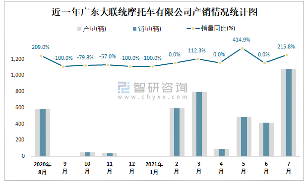 近一年廣東大聯(lián)統(tǒng)摩托車有限公司產銷情況統(tǒng)計圖