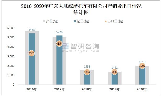 2016-2020年廣東大聯(lián)統(tǒng)摩托車有限公司產銷及出口情況統(tǒng)計圖