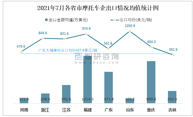 2021年7月各省市摩托車企出口情況均值統計圖