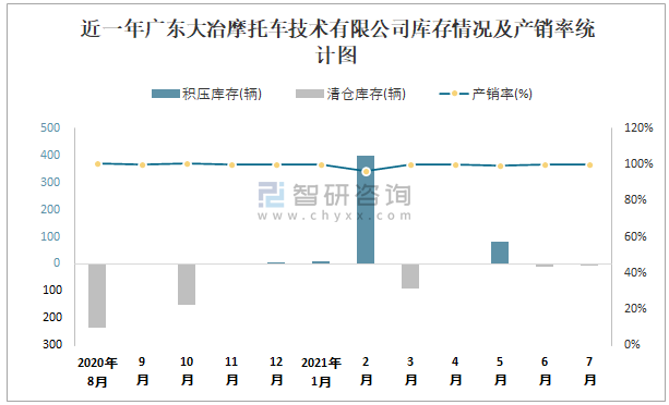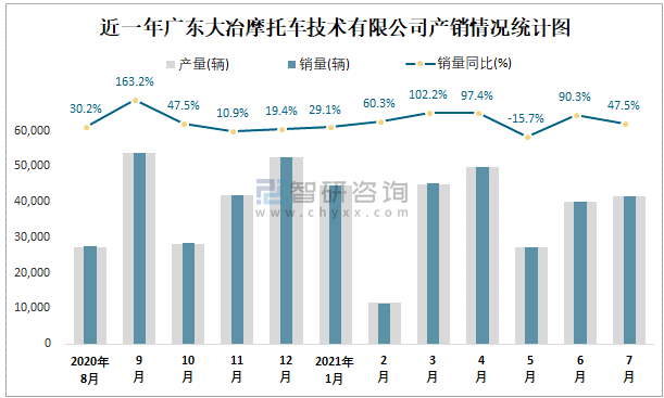 近一年廣東大冶摩托車技術有限公司產銷情況統計圖