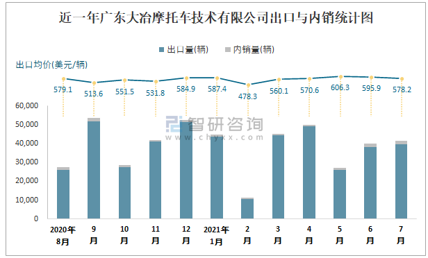 根據中國汽車工業(摩托車)產銷快訊數據統計可知:近一年廣東大冶摩托車技術有限公司(摩托車)共清倉庫存8輛,其產銷率存在一定幅度波動,2020年8月產銷率最高(100.86%),清倉庫存234輛,2月產銷率偏低(96.57%),積壓庫存400輛;近一年廣東大冶摩托車技術有限公司(摩托車)總體銷量以出口為主,總出口量占比總銷量的96.9%,出口均價5月達到最高值,此后逐月遞減,其中7月出口量為39614輛,出口均價約為578.22美元/輛;2021年1-7月廣東大冶摩托車技術有限公司(摩托車)累計出口量為251879輛,同比增長82.05%,累計出口金額約為14521.04萬美元,同比增長96.5%。