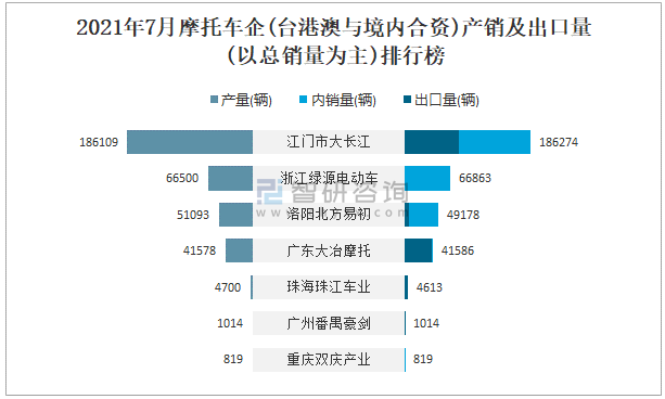 2021年7月摩托車企(臺港澳與境內合資)產銷及出口量(以總銷量為主)排行榜