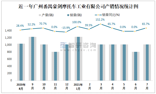 近一年廣州番禺豪劍摩托車工業有限公司產銷情況統計圖