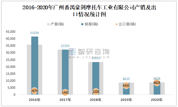 2016-2020年廣州番禺豪劍摩托車工業有限公司產銷及出口情況統計圖