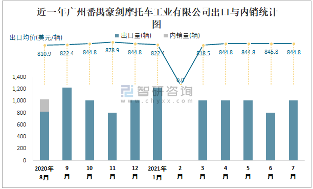 根據中國汽車工業(摩托車)產銷快訊數據統計可知:2021年7月中國摩托車產量總計為1721567輛,同比增長5.6%,銷量總計為1721887輛,同比增長4.26%,產銷率約為100.02%,清倉庫存-320輛,其中總計出口量為723084輛,內銷998803輛,出口均價約為633.62美元/輛。廣州番禺豪劍摩托車工業有限公司作為臺港澳與境內合資的摩托車企業之一,7月銷量相較于同類型車企,排名靠后,且以出口為主。