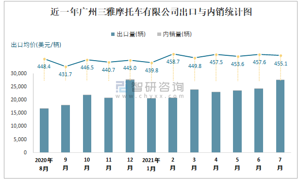 根據中國汽車工業(摩托車)產銷快訊數據統計可知:2021年7月中國摩托車產量總計為1721567輛,同比增長5.6%,銷量總計為1721887輛,同比增長4.26%,產銷率約為100.02%,清倉庫存-320輛,其中總計出口量為723084輛,內銷998803輛,出口均價約為633.62美元/輛。廣州三雅摩托車有限公司作為廣東本土車企的摩托車企業之一,7月銷量相較于同類型車企,排名第7,且以出口為主。