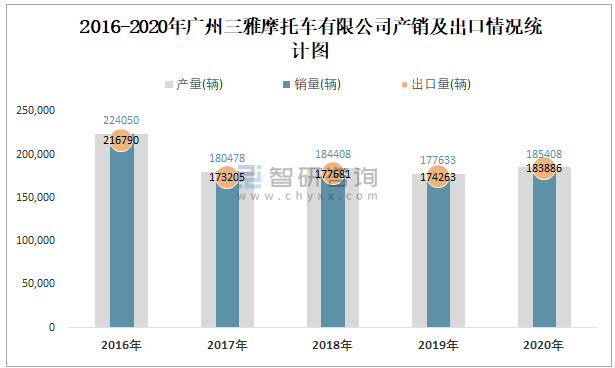 2016-2020年廣州三雅摩托車有限公司產銷及出口情況統計圖