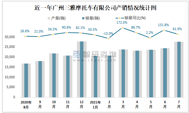 近一年廣州三雅摩托車有限公司產銷情況統計圖