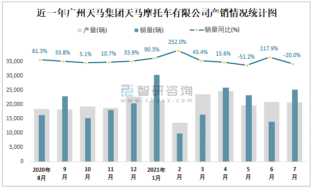 根據(jù)中國(guó)汽車(chē)工業(yè)(摩托車(chē))產(chǎn)銷(xiāo)快訊數(shù)據(jù)顯示:2021年7月廣州天馬集團(tuán)天馬摩托車(chē)有限公司(摩托車(chē))產(chǎn)量為20614輛,同比增長(zhǎng)25.56%,銷(xiāo)量為25218輛,同比下降19.99%;2021年1-7月廣州天馬集團(tuán)天馬摩托車(chē)有限公司(摩托車(chē))累計(jì)產(chǎn)量為143919輛,同比增長(zhǎng)39.57%,累計(jì)銷(xiāo)量為144567輛,同比增長(zhǎng)34.42%;2016-2020年廣州天馬集團(tuán)天馬摩托車(chē)有限公司(摩托車(chē))產(chǎn)銷(xiāo)量2019年跌至最低值,此后有所回升,且近5年總產(chǎn)量大于總銷(xiāo)量,積壓了庫(kù)存7804輛,總體銷(xiāo)量以出口為主。