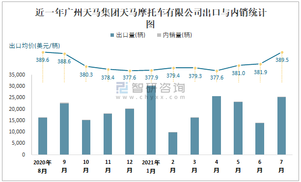 根據(jù)中國(guó)汽車(chē)工業(yè)(摩托車(chē))產(chǎn)銷(xiāo)快訊數(shù)據(jù)統(tǒng)計(jì)可知:2021年7月中國(guó)摩托車(chē)產(chǎn)量總計(jì)為1721567輛,同比增長(zhǎng)5.6%,銷(xiāo)量總計(jì)為1721887輛,同比增長(zhǎng)4.26%,產(chǎn)銷(xiāo)率約為100.02%,清倉(cāng)庫(kù)存-320輛,其中總計(jì)出口量為723084輛,內(nèi)銷(xiāo)998803輛,出口均價(jià)約為633.62美元/輛。廣州天馬集團(tuán)天馬摩托車(chē)有限公司作為廣東本土車(chē)企的摩托車(chē)企業(yè)之一,7月銷(xiāo)量相較于同類(lèi)型車(chē)企,排名比較靠前,且以出口為主。