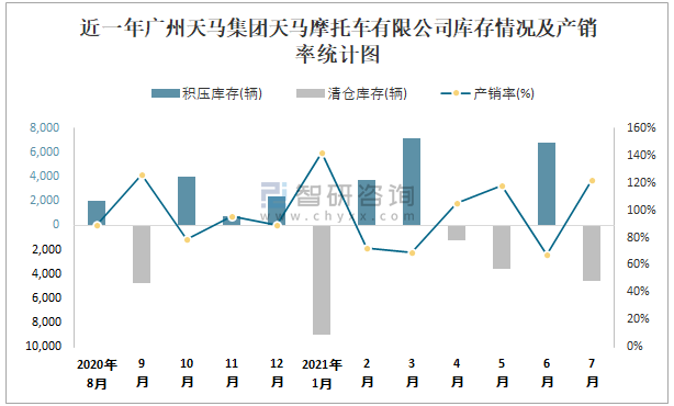 近一年廣州天馬集團(tuán)天馬摩托車(chē)有限公司庫(kù)存情況及產(chǎn)銷(xiāo)率統(tǒng)計(jì)圖